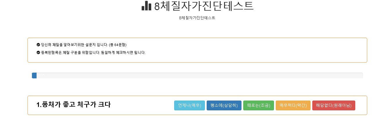 8체질자가진단테스트는 여러 가지 질문을 통해 자신의 체질을 파악하는 방식으로 진행됩니다.